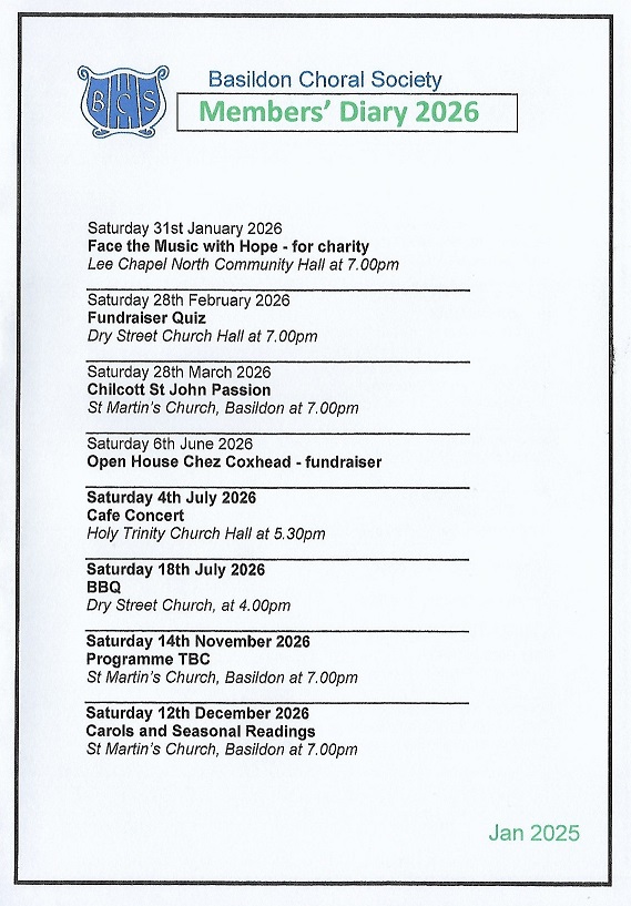 Basildon Choral Society is an amateur choir with a repertoire that ranges widely from motets, masses and challenging modern choral works to spirituals, jazz numbers and arrangements of songs from favourite musicals. We have four seasonal concerts and give a variety of additional performances throughout the year at the request of churches, charities and private organisations - either with the full ensemble or the BCS Small Choir.